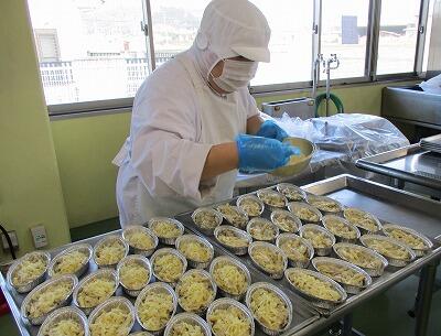 今日は、調理員さんの手作りグラタンです。グラタンの中身を、大きな鍋で作り、それを1個1個丁寧に、カップに入れて、焼き物機で焼いて作っています。「グラタン」はフランスで生まれた料理です。