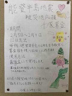 朝の活動の時間に各教室を回って、「能登半島地震 被災地応援 千塚募金」について説明してくれました来週2月5日(月)から9日(金)に募金を集めて、「義援金」として栃木市役所 福祉総務課を通して納め、被災地の方々への寄附をしようというものです