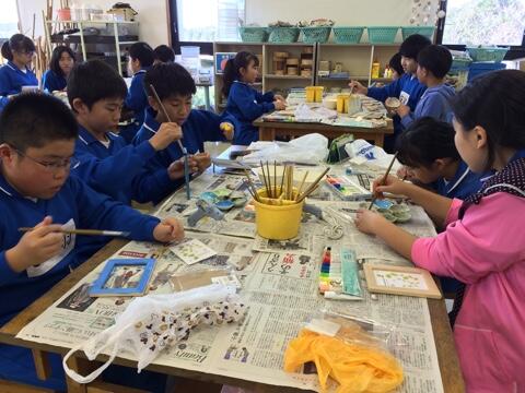 午前中の活動、マリンアートが始まりました!みんな、真剣な表情で取り組んでます。