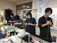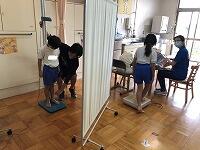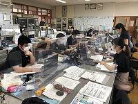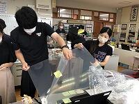 ↓↓ 朝一番に、夏休み中に届いた「アクリル板」の設置をしました。開封・フィルム剥がし・組み立て・設置を全職員で協力して行いました