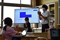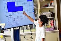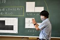 子どもたちは、長方形や正方形の面積の求め方については学習していますが、今回は、長方形や正方形ではない階段のような形の面積の求め方を考えるという、少し難しい課題の学習でした。子どもたちと先生で掲げためあては、「面積の求め方を考え、友達に説明しよう。」で、どのようにして求めたらよいかを、タブレットのMetaMojiを活用して「書く」「動かす」などの機能を用いて、自分の考えを表現していきました