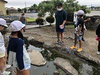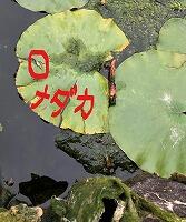 ↓↓ 池のメダカが、浅瀬の方に迷い込んできてしまったので、そっと、大きな池の方へお引っ越しさせてあげたら…なんということでしょう。スイレンの葉っぱに引っかかってしまって・・・やさしい子どもたちは、そうっと池の水をかけながら、大きな池の中へ放してあげていましたよ