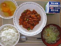 今日の給食のメニューは、「食パン・チョコクリーム 牛乳 タンドリーチキン ジャーマンポテト トマトと卵のスープ」でした。