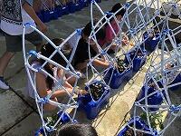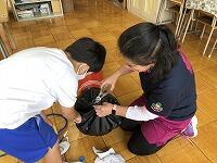 朝、すみれ学級の教室をのぞいてみると…先生と子どもたちが、何か楽しそうな物を準備していました「パンチボール」に、ポンプを使って空気を入れていました。