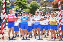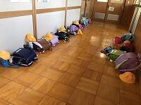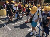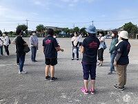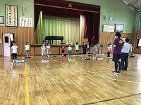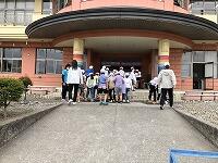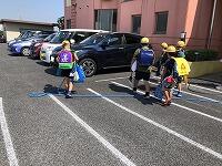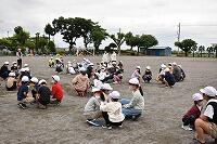 始めに、校庭に集合し、それぞれのペア学年ごとに3グループに分かれて並んで、準備運動をしてから、グループごとに移動開始