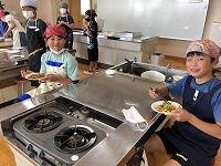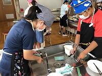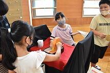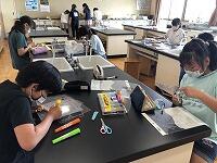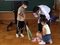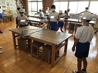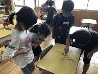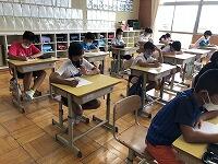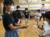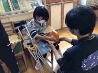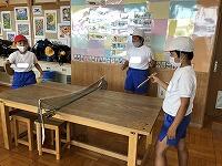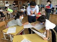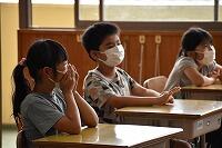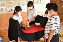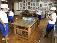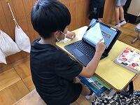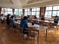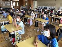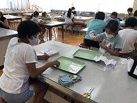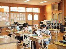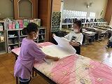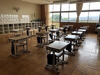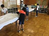 「えのき学童」の子どもたちの人数が多いので、午前中は5・6年生の希望者が校舎内の家庭科室を利用しています。感染症の急拡大への対応として、部屋を分散させるための対策です