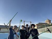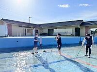 おかげさまで、雷雨は少し遠ざかってくれたようで、清掃も完了し、きれいで清潔な水泳環境が整いました。作業で使った清掃用具の水が切れたので、片付けまで終了来週から、いよいよ水泳学習が始められますね