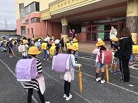 1年生がいつものように、昇降口前に下校班(方面別)に並んで、そこへ2年生と3年生が加わり、よく方面とメンバーを確認しながら「さようなら」をしました。