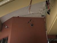 2階のベランダを見ると・・・ツバメが軒下に巣作りしようと近づいてきます。でも、子どもたちの安全を考慮して、技能員の先生が網を張ってくださっているので、うまく巣が作れないようです。