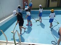 5・6時間目に、5・6年生と教職員が、プール清掃を行いました。天気予報では、午後から雷雨とのことだったので、「雨雲レーダー」をこまめに確認しながら作業を進めました。