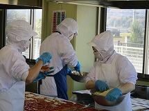 ピザトーストを作る時は、パンを並べ、ピザソースをのせる人、塗る人、のばす人、チーズをふりかける人、焼けたピザをパン箱に数えて入れる人など、調理員さんが作業を分担し、一枚ずつ丁寧に焼き上げています。450人分を作るのは、とても手間のかかる作業です。