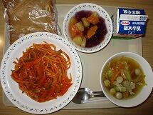 今日の給食のメニューは、「ミニ黒食パン 牛乳 ナポリタン 野菜スープ ぶどうのジュレポンチ」でした。