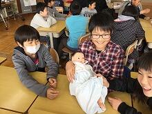 2月21日(水)、助産師の先生にお越しいただき「生命誕生」についてお話をうかがいました。はじめに赤ちゃんが産まれるまでの話を聞き、自分たちの命がかけがえのないものであることを改めて知ることができました。また、その後には赤ちゃんの人形を実際に抱きながら、赤ちゃんが安心できる抱き方や接し方について学びました。人形を抱くことに、はじめは照れくさそうにしていた子どもたちですが、徐々に表情がやわらかく優しく変わっていく様子が見られ、とてもほほえましく感じました。