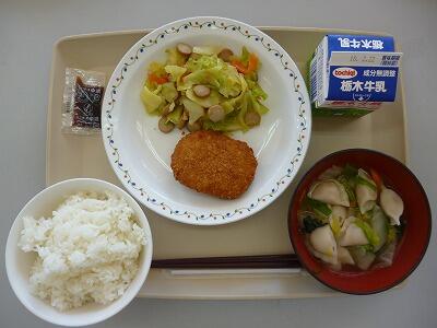 ☆ごはん 牛乳 コロッケ 野菜のカレーソテー ぎょうざスープ(皆川城東小・皆川中学校はバーガーパン)☆