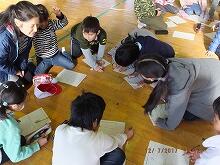 たくさんの円が描いてある紙が配られ、円を利用して果物や動物の略図を、グループで相談、工夫してたくさん描きました。上手なグループには後で校長先生から賞品がもらえます。