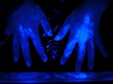 特殊な薬剤を手に塗り、普段通りの手洗いをし、ブラックボックスの中に手を入れ、洗い残しの場所をチェックしました
