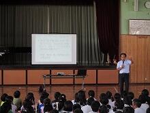 9月13日学校公開日の業間の時間に、校長先生の講話朝会がありました。日本語のおもしろさについてのお話でした。児童はもちろん、保護者や教員も話のおもしろさに引き込まれました。