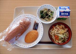 今日の給食は、ミニ黒コッペパン、牛乳、きつねうどん、野菜コロッケ、磯香あえです。