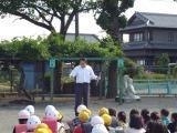 今回は、校内に不審者が入ったという設定で行われ、子どもたちは校庭に逃げるときも真剣に行動することができました。