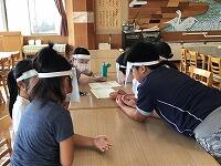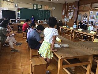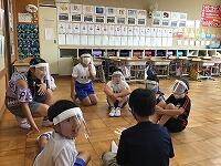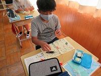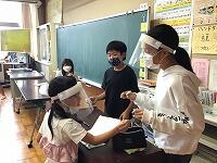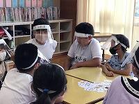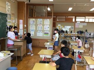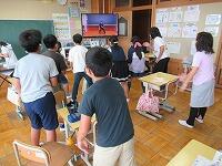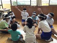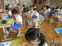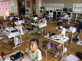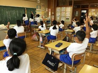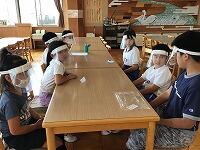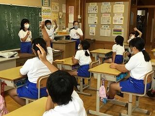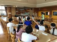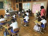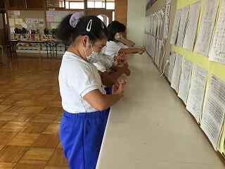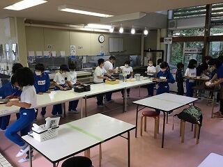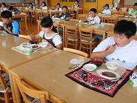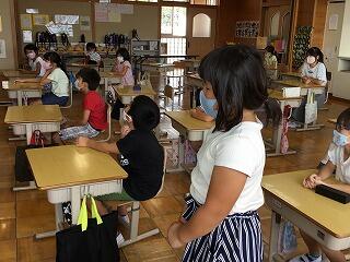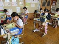 6月からの給食を食べる場所が変わり、1から4年生は、教室で食べています。黒板の方を向いて、おしゃべりをせずに一生懸命に食べています。2年生は、給食のマナーの歌を作って、食べる前に唱えています。