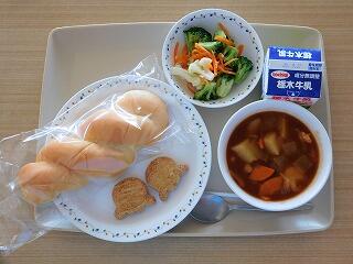 今日の給食は、背割りコッペパン、ドライカレー、牛乳、ブロッコリーサラダ、とうもろこしスープ、目の愛護デーゼリーです。
