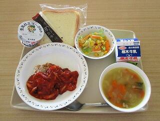 今日の給食は、ツイストミルクパン、牛乳、タンドリーチキン、アルファベットパスタスープ