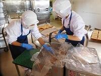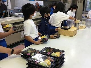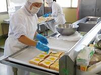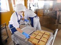 今日 はピザトーストです。ピザトーストは、調理場 で野菜 を炒 めピザソースを作 り、1 枚 1 枚食 パンにソースを塗 り、チーズをのせて焼 いています。全部 で380 人分 のピザトーストをつくり、調理員 さんが1つ1つ袋 に入 れてくれています。調理員 さんの愛情 がたっぷり詰 まったピザトースト、感謝 の気持 ちを忘 れずにいただきましょう。