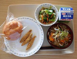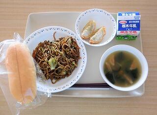 今日の給食は、焼きそばパン、牛乳、焼き餃子、中華野菜スープです。