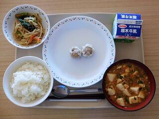 今日の給食は、ごはん、牛乳、マーボー春雨、プチ餃子スープです。