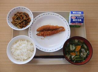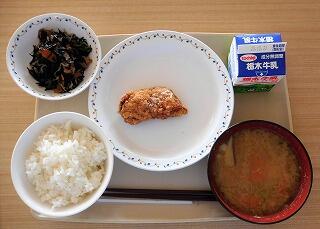 今日の給食は、ごはん、牛乳、鶏肉のからあげ、ひじきの炒め煮、さつまいも汁です。