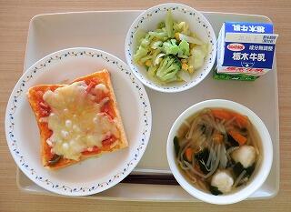 今日の給食は、ピザトースト、牛乳、イタリアンサラダ、エビボールスープです。