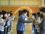 第2部の始めは、6年生へプレゼントです。「ありがとうの花」~千塚小バージョン~を、元気いっぱい歌うことができました。歌の最後には、各学年からのメッセージを伝えました。そして、手作りのプレゼントを渡しました。似顔絵入り写真立てとメッセージ入りの下敷き、千塚愛ちゃんのキーホルダーを送りました。