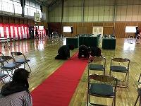 赤と白の幕に囲まれた体育館は、一気に、お祝いムードたっぷりになりましたよ演台の緑色のカバーをかけ、ステージに国旗と市旗を掲げ、グランドピアノの移動もしました