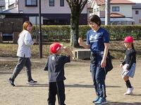 シニアクラブの方から優しく輪投げの投げ方やコツを教わった4年生。