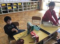 てこの学習が終わり、「手回し発電機」を使って豆電球を光らせたり、モーターを使ってプロペラを回したりして、
