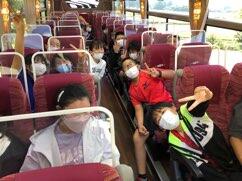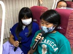 昇降口前で出発式を行い、バス2台に分かれて乗車していよいよ出発です