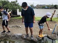 ↓↓ 池のメダカが、浅瀬の方に迷い込んできてしまったので、そっと、大きな池の方へお引っ越しさせてあげたら…なんということでしょう。スイレンの葉っぱに引っかかってしまって・・・やさしい子どもたちは、そうっと池の水をかけながら、大きな池の中へ放してあげていましたよ