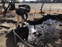 ところが、子どもたちの去った後の池は、だいぶ乱れてしまったようです特に、鳥よけに張っていた糸が切れてしまったので、技能員の先生が、直してくださっていましたよ