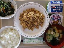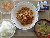 今日の給食のメニューは、「ごはん 牛乳 ピリ辛まぜご飯の具 小松菜と卵のスープ フルーツヨーグルト」でした。
