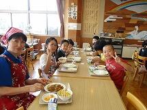 今日はALTのエナ先生も一緒に給食を食べています。