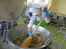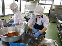 給食室では、なすが苦手な子供達のために、皮をまだらに剥き、油で揚げてから調理しています。また、生のトマトを「湯むき」という方法で、一つ一つていねいに皮をむいてスパゲティソースを作っています。おいしいトマトソースなので残さず食べましょう。