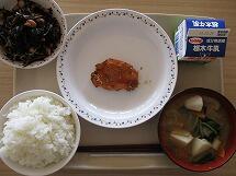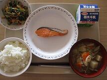 今日の給食のメニューは、「ごはん 牛乳 鮭の塩焼き 小松菜と白菜のごまあえ 豚汁」でした。