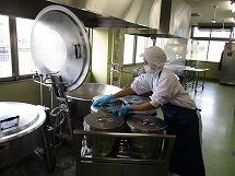 給食室の様子の写真です。7人の調理員さんが、交代で勤務して毎日、朝早くから皆さんのおいしい給食を作ってくださっています。残さず、全部食べて調理員さんに感謝の気持ちを伝えましょうね。