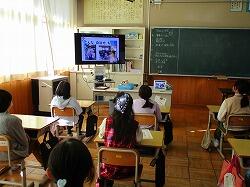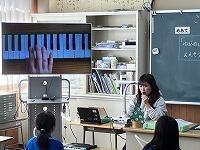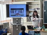 先生の演奏を大型テレビで見ながら、「指移動」に気を付けて演奏するという「今日のめあて」を確認します。