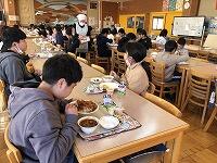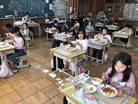 【1・2年生教室】クラスごとに配膳をして、間隔を開けて食事をしています