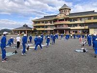 朝早くから集まって、校長先生とキャプテンの話を聴いてから、身体慣らしをしました。