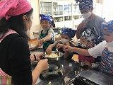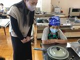 ①まずは、教師が調理し、手順を確認しました。味見もばっちり!