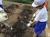 協力して、苗植えを行いました熱い日差しに負けず、名人たちは苗を一つ一つ丁寧に植えることができました。忘れずに水やりも行いました