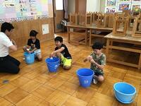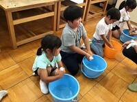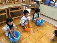 最後に、ぞうきんをしっかりゆすいで、しぼってみました。「たてしぼり」に挑戦!手首に負担が少ない絞り方だそうです。