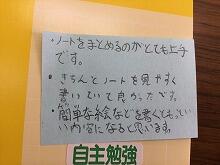 審査のポイントは①ノートを無駄に使っていないか。②学年にあった学習内容か。③毎日こつこつと行っているか。の3点。今回は5年生が6年生のノートを、6年生が5年生のノートを審査しました。子どもたちは、「すごい!」「もっとこうすると良くなるのにな」など感想を口にしながら、よくまとめられている家庭学習ノートを選び、最後にアドバイスや良かったところなどを付箋に書いて渡しました。